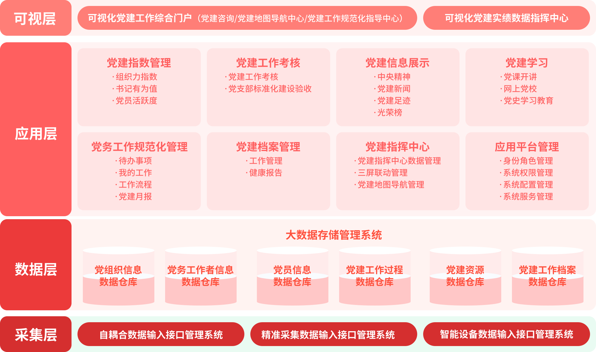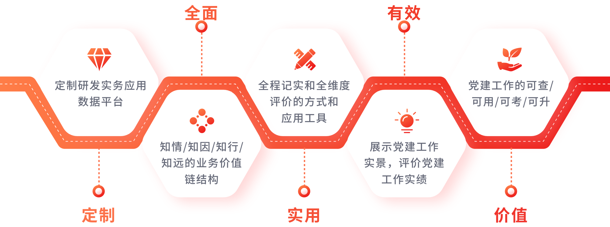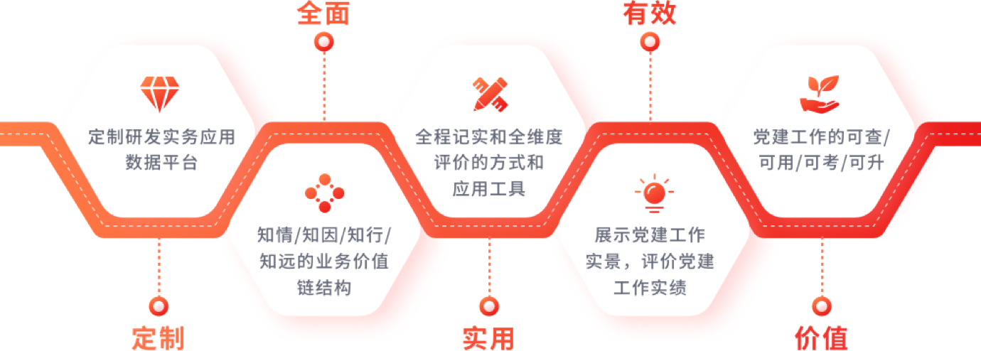 党务工作考核管理平台是服务于新时代党建工作的创新应用系统,是专门为各级组织有效推动党建工作、提升引领作用发挥而定制的一款实务应用数据平台,通过“知情、知因、知行、知远”的业务价值链结构,通过全程记实和全维度评价的方式为党建工作规范化提供一系列模块化的应用工具,展示党建工作实景,评价党建工作实绩,实现党建工作的“可查、可用、可考、可升”,为党建引领作用发挥提供最直接、最重要、最有效、最全面的记实依据和权责链条。